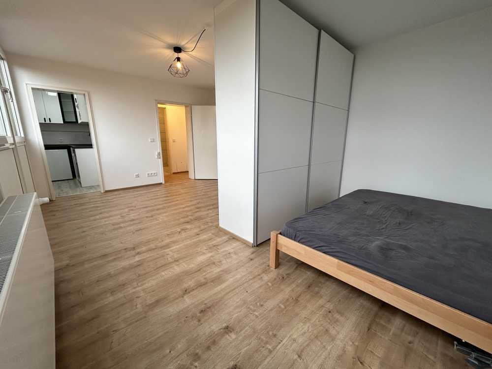 Die Wohnung besteht aus einem attraktiven, hellen Zimmer mit großer Glasfront mit unverbautem Blick. Ein großer Kleiderschrank mit Schiebetüren ist als Raumteiler zum Schlafbereich fest eingebaut. Im Schafbereich befindet sich ein Bett mit 140x200 cm Liegefläche. Die moderne Einbauküche ist ausgestattet mit Geschirrspüler, Kühlschrank mit Gefrierfach, Induktionsherdplatte und Mikrowelle. Das hell geflieste Bad mit bodengleicher Dusche, Glastrennwand, Spiegelschrank und Handtuchheizkörper entspricht dem aktuellen und gehobenen Standard. Der Garderobenbereich ist ausgestattet mit einem Spiegeltürschrank. Im abgeschlossenen Kellerabteil gibt es bereits einen Schrank als Stauraum. Im Haus befindet sich eine allgemein zugängliche Waschküche. Das Objekt ist barrierefrei zugänglich und mit einem Fahrstuhl erreicht man den 5. Stock.