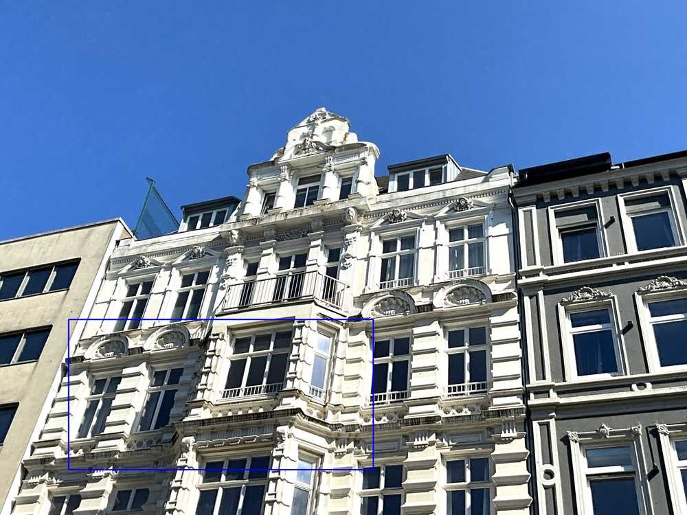 Ein weitläufiger Flur bildet das Herzstück der Wohnung und verbindet alle Räume miteinander. Zwei Zimmer mit Blick zum Steindamm lassen sich durch eine wandintegrierte Doppelschiebetür miteinander verbinden. Die restlichen Räume sind zum ruhigen Lichthof oder Innenhof orientiert und bieten dadurch eine besonders friedliche Wohnatmosphäre.