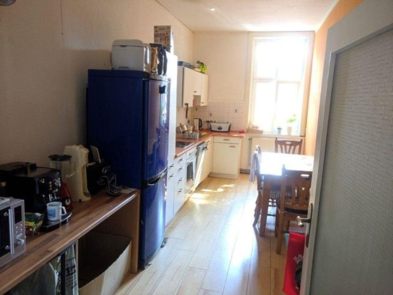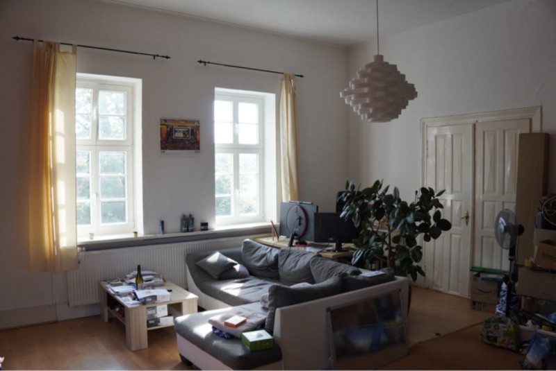 Dein zukünftiges Zimmer ist mit 37 m² das größte Zimmer der WG und grenzt an die Küche und das Wohnzimmer.. Es ist zur Hälfte mit einem Teppich und zur anderen Hälfte mit Parkett ausgelegt. Das Zimmer ist aufgrund der süd-östlichen Ausrichtung und der drei Fenster sehr hell. Ein Fenster zeigt zum so gut wie nie genutzten Innenhof des Grundstückes und die anderen beiden zur alten Apotheke, einem leerstehenden, historischen Gebäude. Da sich die WG im hinteren Teil des Hauses befindet ist es sehr ruhig.