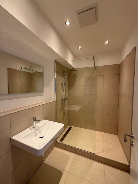 Die Wohnung überzeugt mit einem durchdachten Grundriss: Das separate WC und das modern gestaltete Badezimmer mit großformatigen, beigen Fliesen und einer tollen Dusche sorgen für Komfort im Alltag.