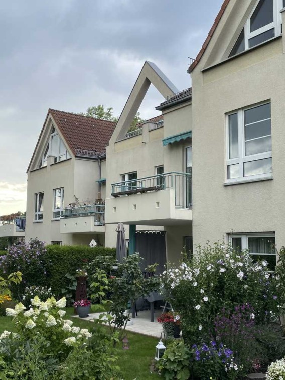 Die Anlage bestehend aus zwei Häusern mit 20 Wohnungen ist sehr gepflegt und ruhig. Gegenüber gibt es eine riesige Wiese, die der Gegend einen ländlichen Charakter verleiht.