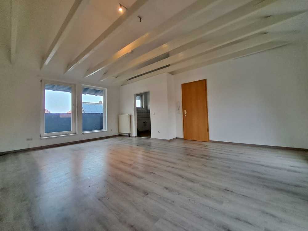 Zentraler Bereich der Wohnung ist das große Wohnzimmer mit der angrenzenden Küche. Hier haben Sie ausreichend Platz, einen gemütlichen Wohn- und Essbereich einzurichten. Der großzügige Raum mit offener Balkenlage ist ein echter Hingucker.