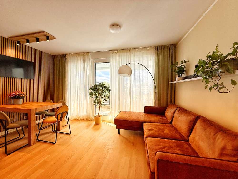 • Großzügiges Wohnzimmer mit offener, neuwertiger Einbauküche und hochwertiger Sitzecke