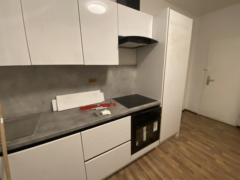 Es steht eine neu eingebaute Wohnküche mit Spülmaschine und Kühlschrank zur Verfügung.