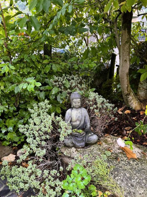 Ein großzügiger überdachter Balkon umgeben von lauschigen Baumen bietet im Sommer ein weiteres "Zimmer"