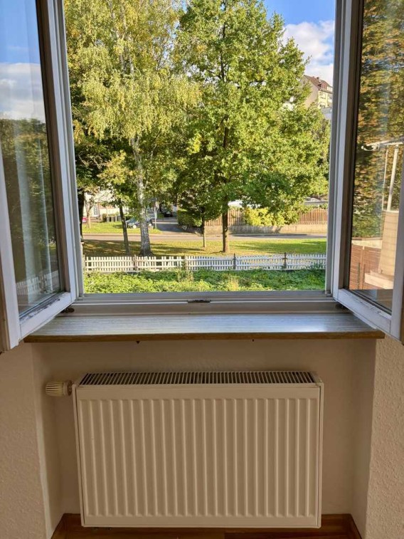 • Großzügiges Wohnzimmer (ca. 22 m²) mit 3 Fenstern und Blick ins Grüne