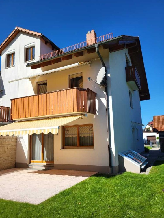Beim Betreten des Hauses empfängt Sie ein großzügiger Eingangsbereich mit Zugang zur Gästetoilette. Durch eine weitere Türe betreten Sie den geräumigen Flur und das Treppenhaus. Von hier gelangen Sie in die große helle Wohnküche. Eine Türe führt auf die vor der Küche gelegene Terrasse mit Westausrichtung. Auf der anderen Seite des Flurs betreten Sie das Wohnzimmer mit Parkettboden und einem gemütlichen Kachelofen, der vom Flur aus beheizt werden kann. Der Parkettboden wird derzeit neu abgeschliffen und eingelassen. Auch hier gibt es viel Licht und eine weitere Terrasse in Ausrichtung nach Osten, die mit einer elektrischen Markise versehen ist.