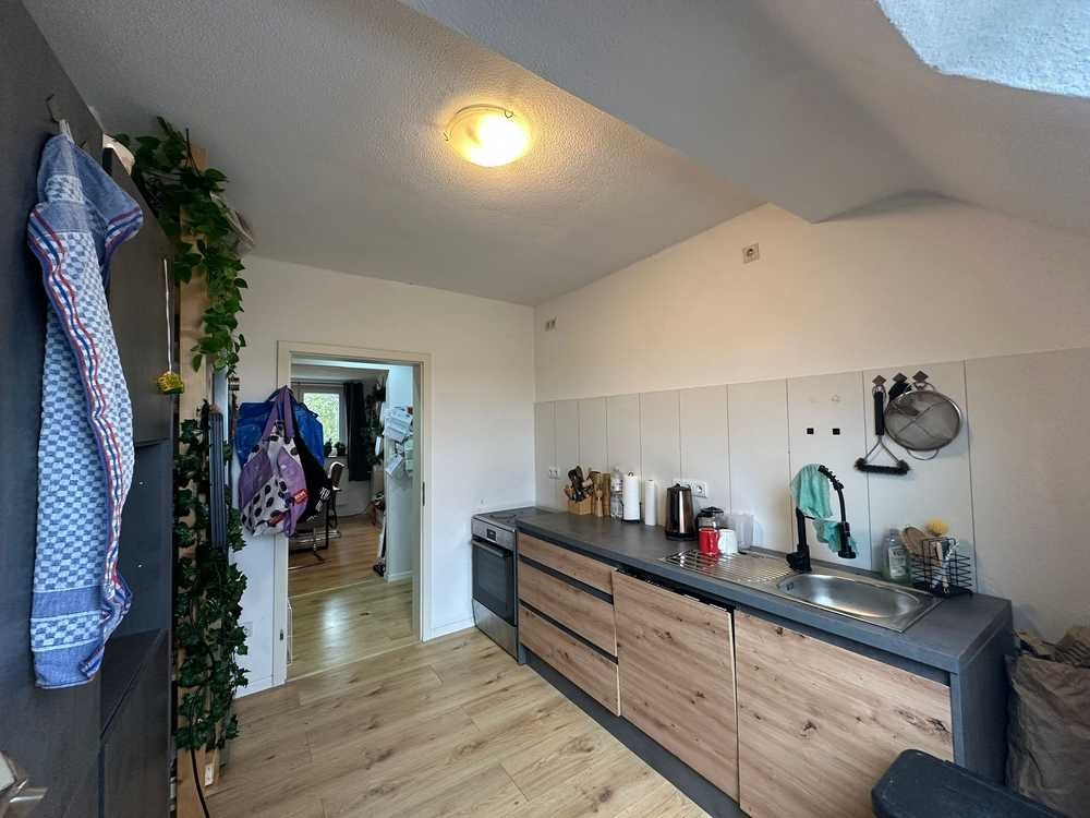 Beim betreten der Wohnung gelangt man direkt in die Diele. Rechts befindet sich der helle Wohn- und Essbereich, der durch die großen Fenster und gemütliche Dachschrägen eine einladende Atmosphäre bietet. Gegenüber vom Wohn- und Essbereich liegt die Küche, die mit ausreichend Stauraum überzeugt. Geradeaus durch die Diele erreicht man das Badezimmer, das mit einer Badewanne und einem Fenster ausgestattet ist. Rechts neben dem Badezimmer befindet sich das Schlafzimmer mit idealem Schnitt für ein Doppelbett und einem Schrank. Links neben dem Badezimmer liegt ein zusätzlicher Raum, der sich hervorragend als Büro, nutzen lässt.