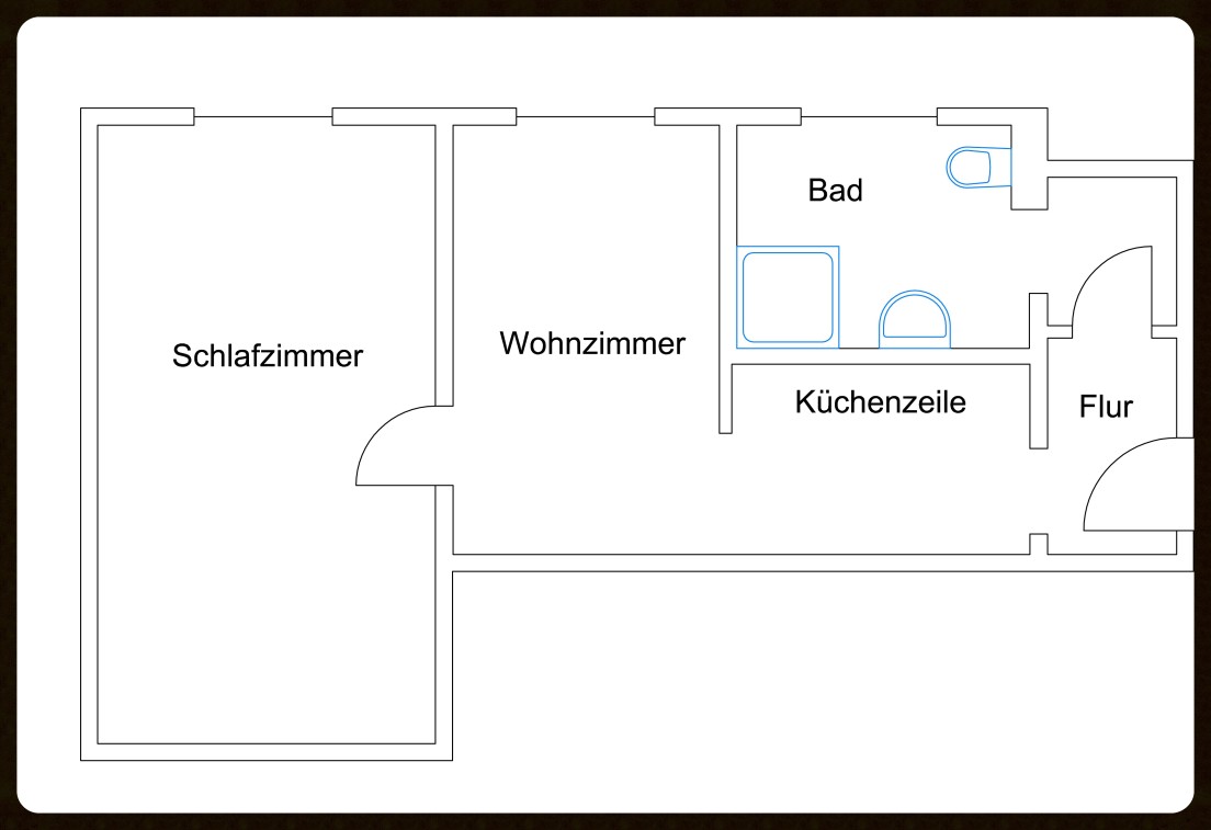 Die Wohnung befindet sich im 2. OG und besteht aus zwei Zimmern, hat ein Bad mit Dusche und Fenster. Die Wohnung hat keinen Balkon .
