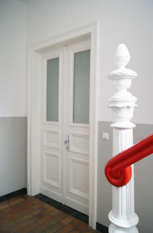 Die Holzfenster (mit Wärmeschutzverglasung) und die Holztüren wurden nach historischen Vorbildern angefertigt und tragen zusammen mit den Massivholzdielen im gesamten Wohnbereich (Ausnahme: Badezimmer, hier sind zeitlos-schöne Betonsteinfliesen verbaut) viel zu dem großzügigen Altbau-Flair bei.