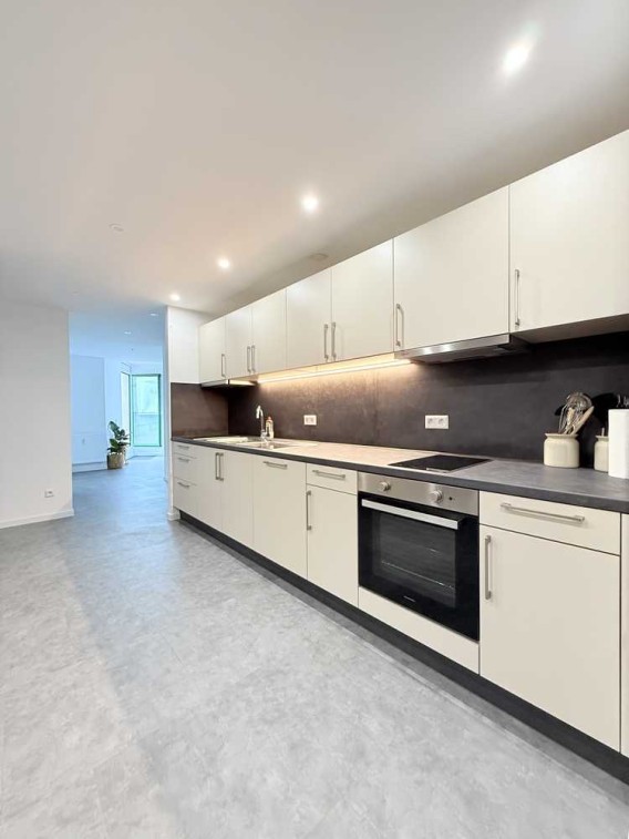 Der große Gemeinschaftsbereich bildet das Herzstück der WG: Ein offener, lichtdurchfluteter Raum mit gemütlichem Essbereich und einer nagelneuen Einbauküche, die keine Wünsche offenlässt. Die Küche ist komplett ausgestattet und im Mietpreis bereits inbegriffen.