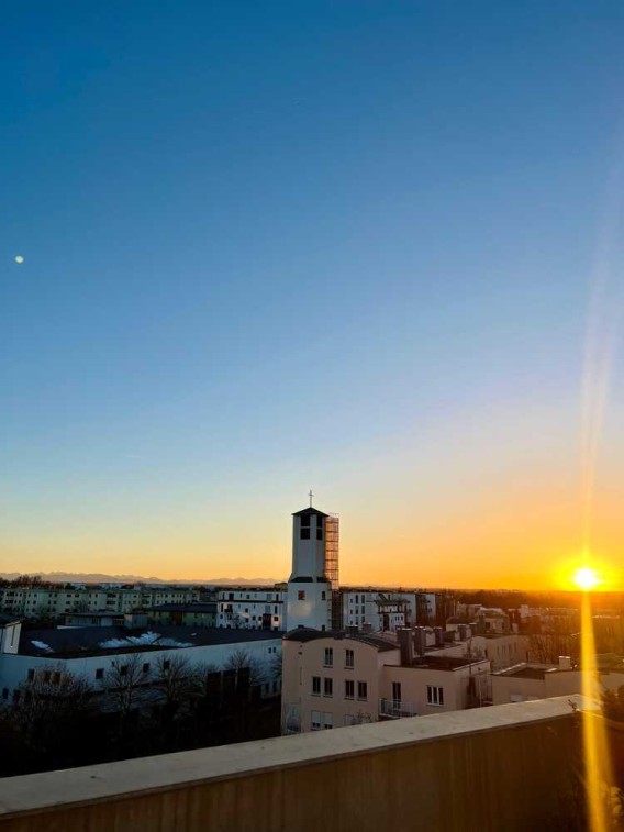 Ein besonders Highlight ist die gemeinschaftliche Dachterrasse auf dem Hausdach von der man einen wunderbaren Weitblick in die Berge und über München genießen kann.