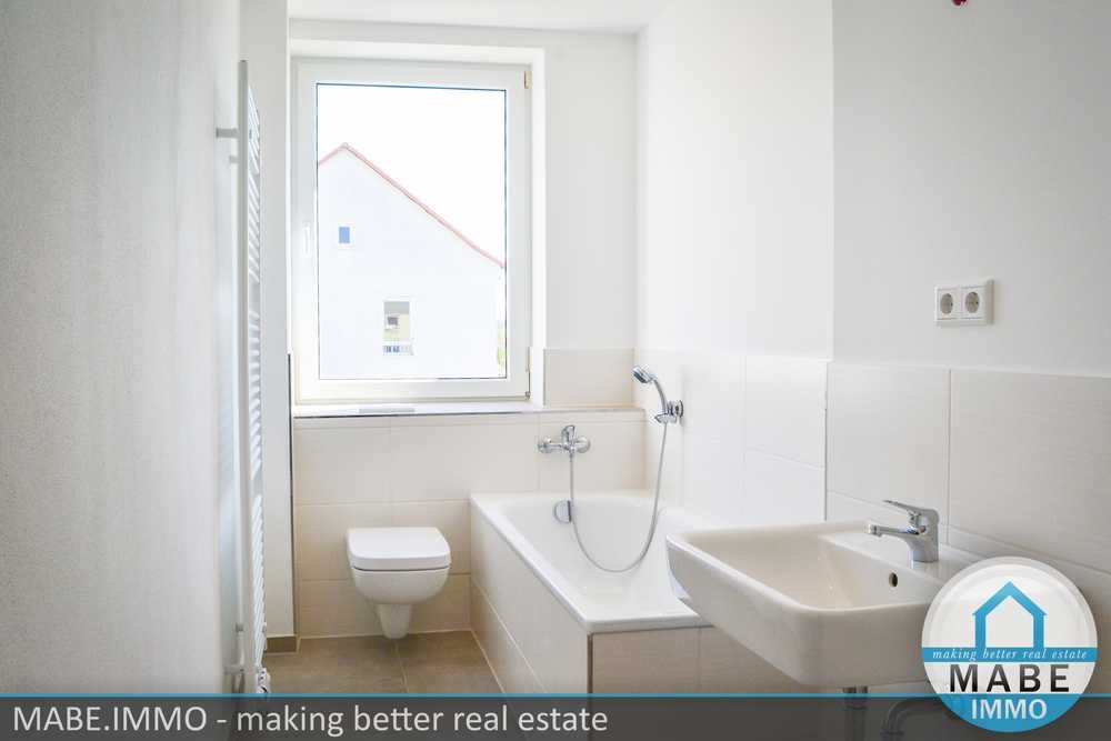 Sie erwartet ein saniertes Badezimmer mit Handtuchheizkörper, ein neuer Fußboden und neue, weiße Türen.