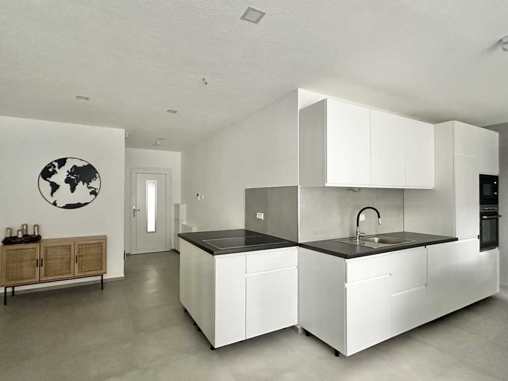 Die moderne Einbauküche mit Kücheninsel fügt sich perfekt in das offene Wohnkonzept ein. Sie kann übernommen werden und ist in einem neuwertigen Zustand.