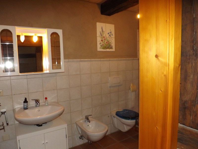 Gästezimmer mit Waschbecken und WC. Historischer Keramikofen (funktional, kann betrieben werden). Großzuggier Flurbereich mit kleinem Lagerraum.