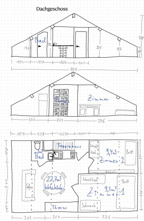 Es sind zwei teilmöblierte Zimmer im Dachgeschoss, mit Duschbad und großzügiger Wohnküche mit Einbauküche an Studierende zu vermieten. Die Zimmer sind 9,4 Quadratmeter und 9,3 Quadratmeter groß, die Wohnküche hat 22,7 Quadratmeter und das Bad 2 Quadratmeter. Alle Flächen sind jeweils mit Dachschrägen, wie aus dem Plan ersichtlich.
