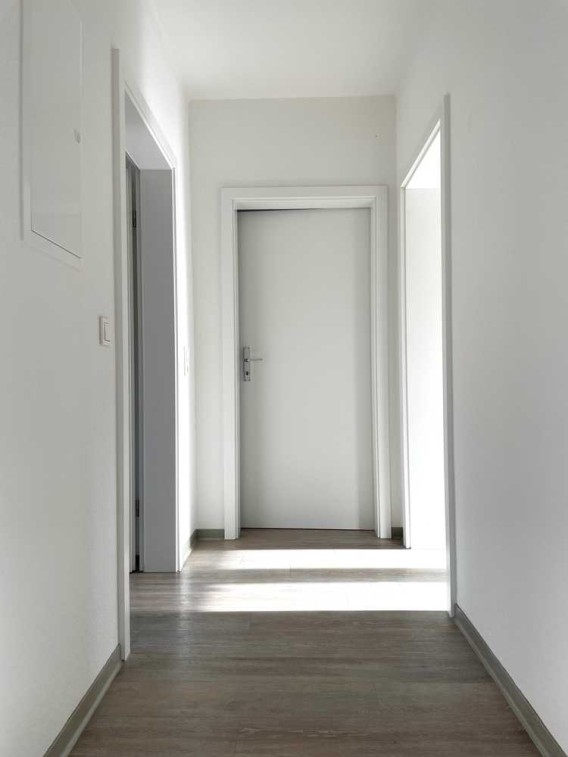 Auch die Wohnung wird vollständig renoviert und modern hergerichtet. Alle Räume erhalten einen schicken Design-Vinyl Boden in Holzoptik und weiße Raufasertapete. Auch das Badezimmer wird erneuert und mit einem Wand-WC, Waschtisch, Dusche und einem Handtuch-Heizkörper ausgestattet.