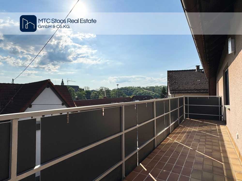 Das weitläufige Wohnzimmer lädt zum Entspannen ein und bietet direkten Zugang zum sonnigen Süd-Balkon mit Blick auf das Birsteiner Schloss. Auch die Küche verfügt über einen eigenen Zugang zum Balkon.