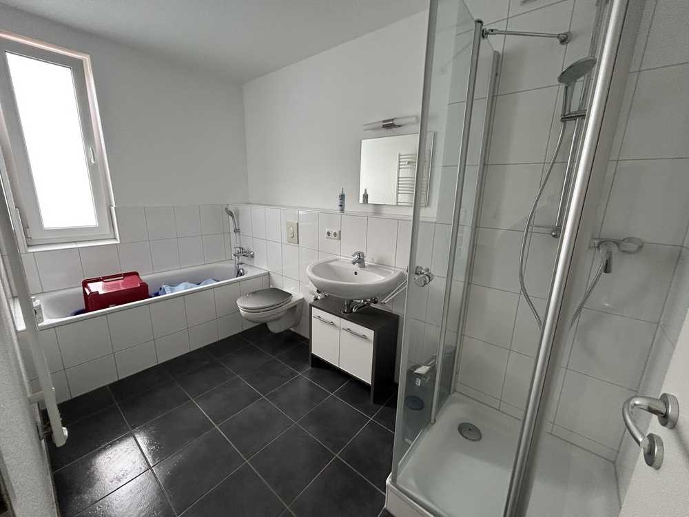 Helles, großes Bad mit Fenster, Dusche und Badewanne – ideal zum Wohlfühlen.