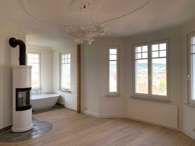 Es schliessen sich zwei gleichgroße Kinder- oder Arbeitszimmer an, eines davon mit historischem Stuck. Darauf folgt ein großzügiger Wohnraum mit Fenstern zu drei Seiten und genügend Platz für eine große Sitzlandschaft. Dann kommt das Erkerzimmer: ein echtes Highlight mit Kamin und freistehender Badewanne. Von hier aus sieht man ganz Feuerbach und einen wunderschönen Sonnenuntergang. Neben der Wanne beginnt das große Bad mit aussergewöhnlich schönem Waschtisch und viel Stauraum für Kosmetika etc. Die Dusche ist bodeneben. Das WC kann von zwei Seiten aus betreten werden. Zurück geht es über den Flur, der auch ins herrschaftliche Treppenhaus der Grunderzeitvilla führt und über dort in den Gewölbekeller, von dem ein Drittel zu dieser Einheit gehört. Wieder zurück Richtung Küche gibt es dann noch ein wunderschönes und großzügiges Gästebad mit Dusche, Toilette und Waschbecken.