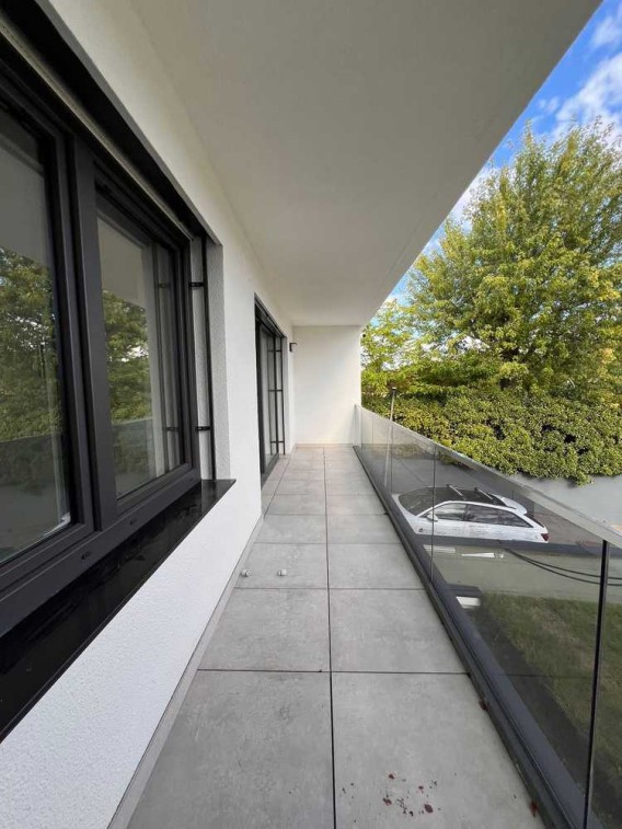 • Großer Balkon mit Glasgeländer und Feinsteinzeugplatten