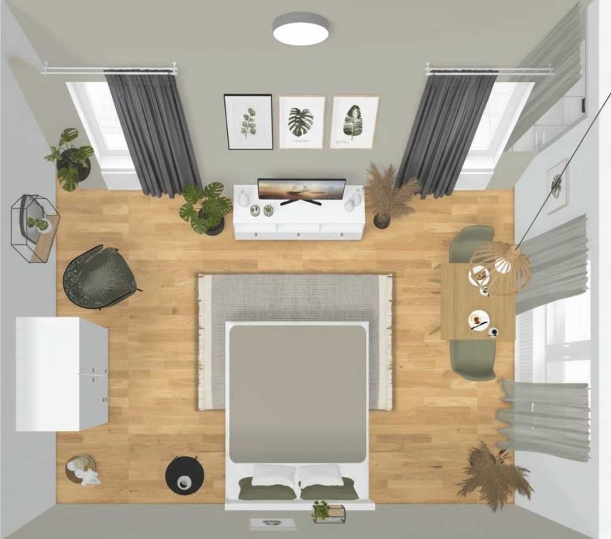 Esstisch, 2 Stühle, TV-Board, Lounge-Sessel, Bett mit Matratze, Wollteppich, Beistelltisch mit Tischleuchte, Kleiderschrank, Spiegel, Garderobe, Schuhregal, Deko, Vorhänge, Leuchten in Bad, Küche, Wohnzimmer.