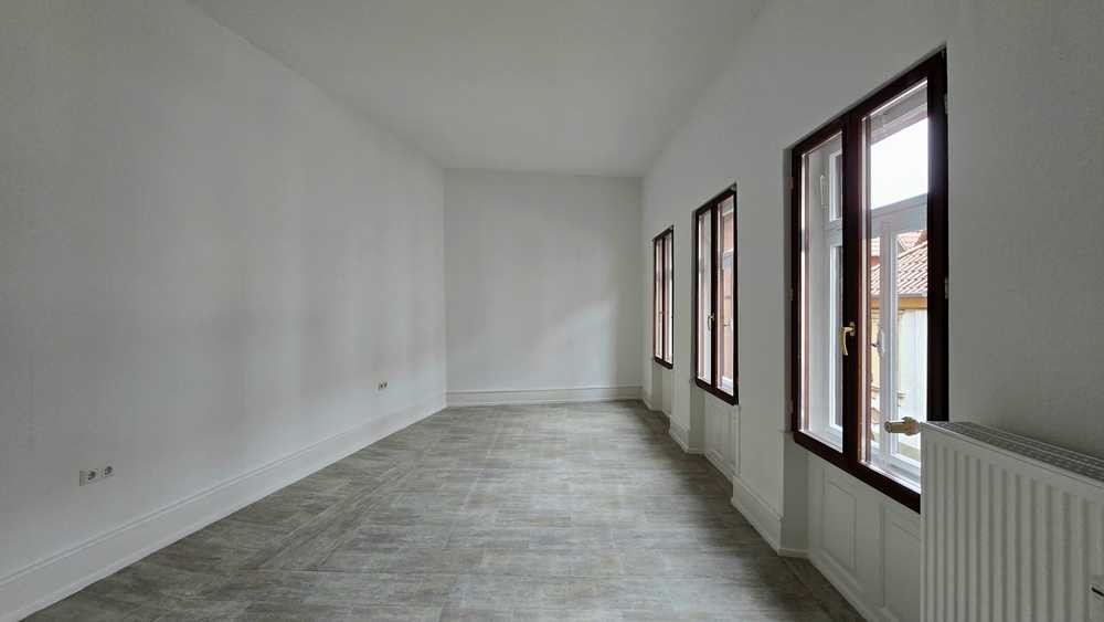 Das Wohnzimmer besticht durch seinen charmanten Altbau-Charakter mit mehreren Fenstern und einem schönen Blick in die Stadt.