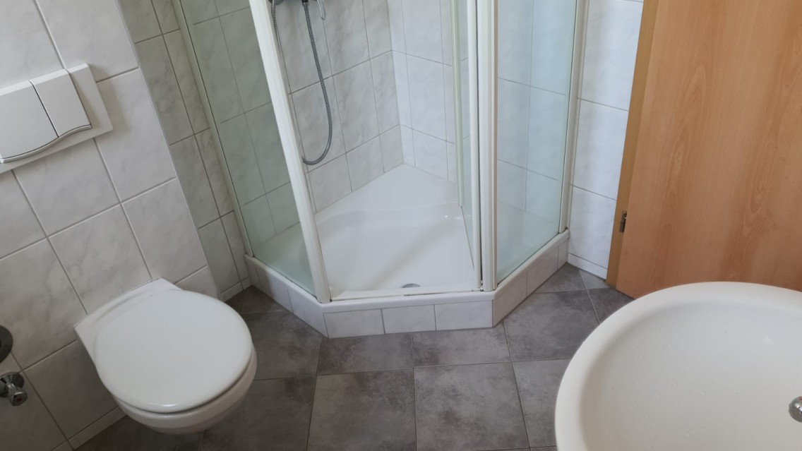 Bad mit 2 Fenstern, Wohnzimmer, Küche, Bad und Flur sind gefliest, Wohnzimmer und Küche mit Fußbodenheizung. Schlafstube mit Laminatfußboden.