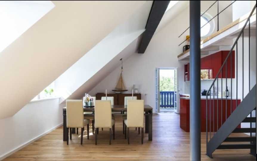 Die rot lackierte Küche bildet das Herzstück der offenen, lichtdurchfluteten Wohnung im 2. Stock. Ess- und Wohnzimmer schließen sich an und bieten jede Menge Raum. Auf der Galerie befinden sich ein Doppelbett sowie ein Arbeitsbereich. Das Schlafzimmer befindet sich in einem separaten Raum.