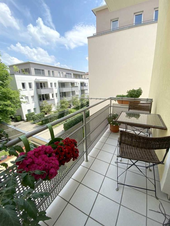 Es besteht ein reizvoller Balkon zum begrünten Innenhof des Anwesens. Zur Wohnung gehört ein geräumiger Keller.