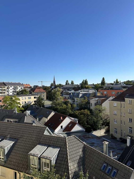 Die Küche (SieMatic) bietet genug Platz um hier an einen kleinen Hochtisch zu frühstücken und den Blick bis hin zur Mariahilfkirche zu genießen. Von der Küche aus betreten Sie den kleinen Ost-Balkon, der in der Morgensonne zu einem Weitblick über die Dächer der schönen Au, einlädt.