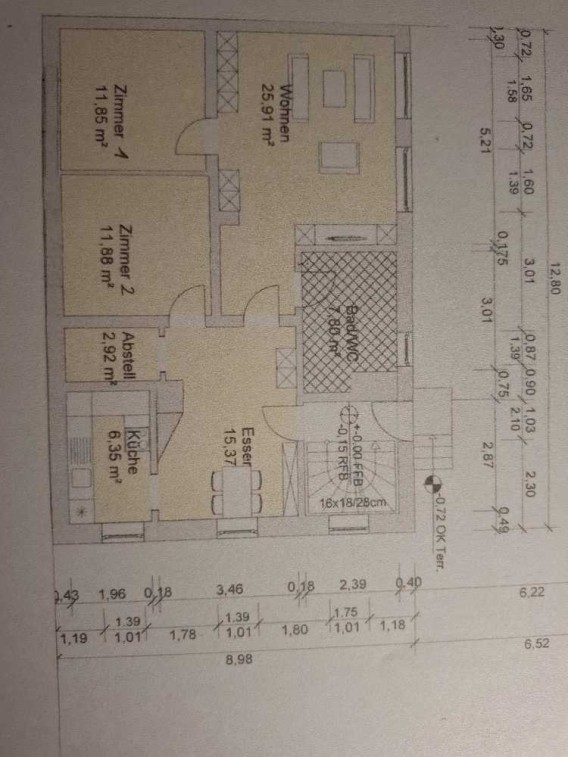 Renovierter Altbau, Wärmeschtz. Wohnung mit 3 Zimmern, Küche mit großem Essbereich, Flur und Abstellkammer. Die Wohnung hat 82 m² es werden aber nur 70m² berechnet. Zimmer 1 + 2 im Plan haben kein eigenes Fenster nach außen. Zimmer 1 wir durch eine Glastür und ein Fenster vom Wohnzimmer aus belichtet und belüftet. Zimmer 2 ebenso. Aus diesem Grund werden nur 70m² berechnet. Parkplatz enthalten.