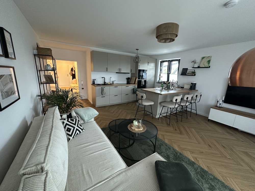 Vermieterseitig ist das Bad mit Sanitärobjekten voll ausgestattet; einschl. Spiegel mit Beleuchtung. Der Flur ist gefliest, der Balkon besitzt Keramikplatten. Die übrigen Böden wurden vom jetzigen Mieter fachgerecht und hochwertig eingebaut und können übernommen werden. Die Einbauküche, bestehend aus einer Küchenzeile mit E-Geräten (Bosch, Privileg) und einem großen Esstisch mit Unterschränken können ebenfalls übernommen werden. Der Erstbezug war Juli 2023 und somit ist alles neuwertig.