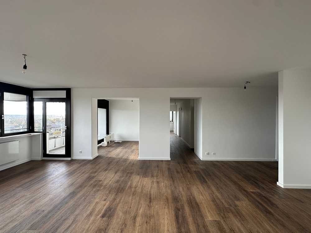 Diese kernsanierte Etagenwohnung im 14. Obergeschoss überzeugt durch eine großzügige Wohnfläche von ca. 108 m², helle Räume und eine exklusive Ausstattung. Das Herzstück der Wohnung ist der weitläufige Wohn- und Essbereich mit offener Küche und direktem Zugang zur Loggia, die einen unverbaubaren Panoramablick auf den Rhein und das Siebengebirge eröffnet. Bodentiefe Fensterfronten sorgen für ein lichtdurchflutetes Ambiente und eine besondere Wohnatmosphäre. Neben dem Elternschlafzimmer stehen zwei weitere Zimmer zur Verfügung, die flexibel als Kinder-, Gäste- oder Hobbyräume genutzt werden können. Das moderne Badezimmer mit ebenerdiger Dusche und großformatigen Fliesen sowie ein separates Gäste-WC runden das Raumangebot ab.
