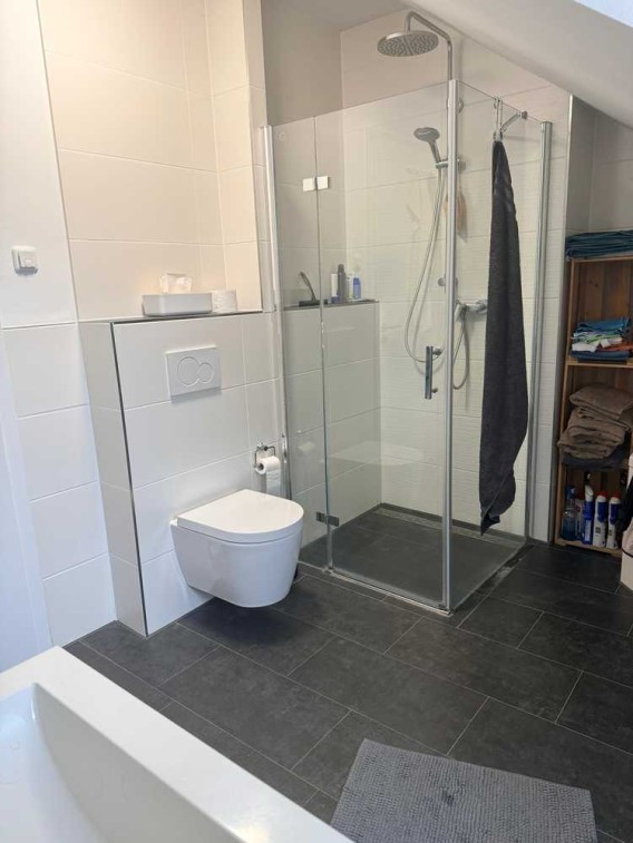 4Zimmer Dachgeschoss Wohnung mit 2grossen Balkonen (jeweils 1,5m tief und 3m breit. Einer Ostseite, einer Westseite. Es gibt einen Speicher über dem Gang in der Wohnung. Eine Einbauküche mit Steinarbeitsplatte ist auch vorhanden. Das Bad hat eine große Eckbadewanne und daneben eine separate Dusche und ein Platz für eine Waschmaschine ist auch vorhanden.