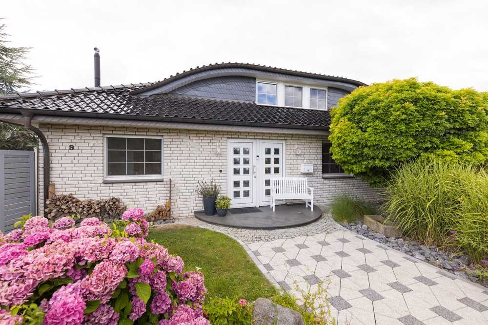 Der Bungalow bietet ebenerdiges Wohnen mit einem ausgebauten Studio im Obergeschoss – ideal für Paare oder kleine Familien. Das helle Wohn- und Esszimmer mit Kamin, Echtholzparkett und offener Küche führt auf eine überdachte Terrasse mit Gartenblick. Zusätzlich gibt es eine zweite Terrasse an der Küche.