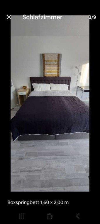 Im Wohn/Schlafzimmer ist mit einem großen Kleiderschrank, Boxspringbett 1,60 m x 2.00 m, einem kleinen Schreibtisch, kleinem Tisch mit zwei Korbstühlen, einem Kühlschrank sowie Wasserkocher und Kaffeemaschine ausgestattet.