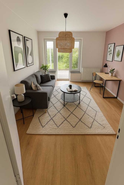61 m² verteilen sich auf ein Schlafzimmer mit Terrassenzugang, ein helles Wohnzimmer, eine Küche mit kleiner Abstellkammer, einen Flur, einen Abstellraum und ein modernes Badezimmer mit Tageslicht. Ein Kellerraum gehört ebenfalls dazu. Der große Garten mit Apfelbäumen darf mitbenutzt werden.