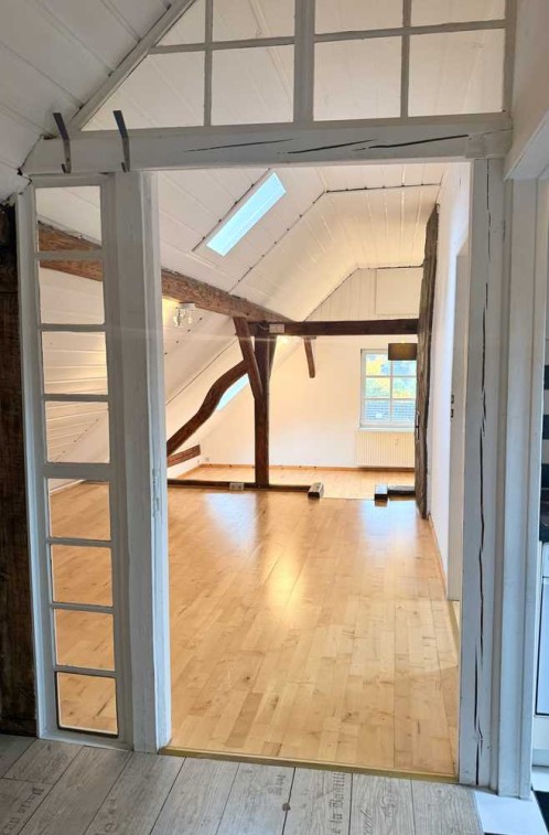 Die Dachfenster sorgen für viel Licht und eröffnen einen herrlichen Blick in die Umgebung der Fachwerkstadt. Die Kombination aus historischen Holzelementen und modernen Details macht diese Wohnung zu einem echten Unikat.