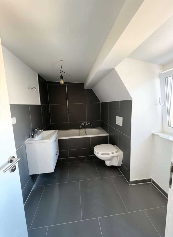 Das moderne Tageslichtbad überzeugt mit edlen, großformatigen dunklen Fliesen und ist mit einer komfortablen Badewanne ausgestattet – perfekt zum Entspannen.