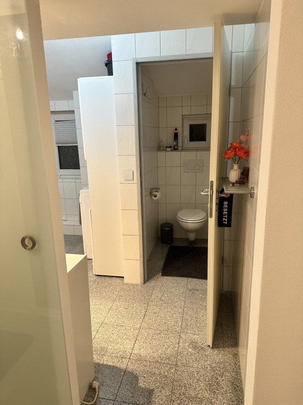Bad und separates WC sind in weiß gehalten mit Natursteinboden. Im Übrigen ist die Wohnung mit hellem Laminat ausgelegt.