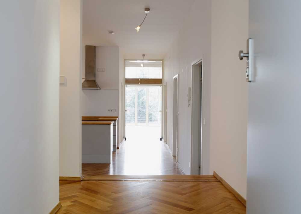 Die Wohnung bietet neben der offenen Küche mit Essbereich und dem Wohnzimmer mit kleiner Galerie (Zutritt zu einem eigenen Speicherraum), drei Schlafräume, zwei Bäder, eine Abstellkammer und ein Kellerabteil. Der große Süd-Balkon (ca. 15 qm) überblickt die angrenzenden Gärten mit altem Baumbestand.