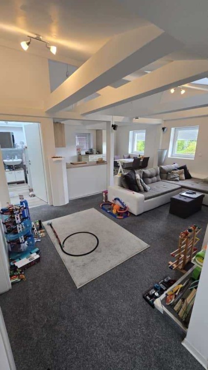 Diese helle, lichtdurchflutete Wohnung im Obergeschoss eines zweistöckigen Mehrfamilienhauses begeistert mit großzügiger Raumaufteilung, offenem Dachstuhl und einem einzigartigen Wohngefühl. Die Kombination aus moderner Ausstattung und naturnaher Lage macht sie zum idealen Zuhause für Paare oder kleine Familien - Hunde sind leider nicht erlaubt.