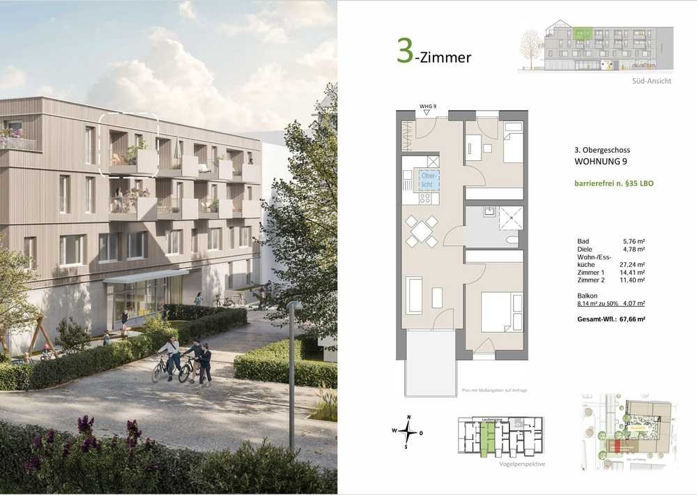 Willkommen in dieser exklusiven 3-Zimmer-Wohnung im obersten Geschoss mit ca. 67,66 m² Wohnfläche. Die Wohnung wurde nach modernsten Standards im Oktober 2025 fertiggestellt. Die angewandte Holz-Hybrid-Bauweise mit dem Energiestandard KfW-Effizienzhaus 40 sorgt für eine hervorragende Wärme- und Schalldämmung. Es wird 60% mehr Energie eingespart, als die Energiesparverordnung vorschreibt. Die Wohnung ist barrierefrei nach § 35 LBO. Im UG stehen ein belüfteter Kellerraum, ein Wasch- und Trockenraum, Abstellplätze für Kinderwägen, Rollstühle und Fahrradabstellplätze zur Verfügung.. Ein Tiefgaragenstellplatz ist der Wohnung zugeordnet. Dieser ist für den Anschluss von E-Autos vorbereitet . Der Personenaufzug bringt einen von der Tiefgarage komfortabel zur Wohnung Die Beheizung erfolgt über Fernwärme, wobei die Heizkosten bereits in der Nebenkostenkalkulation enthalten sind.