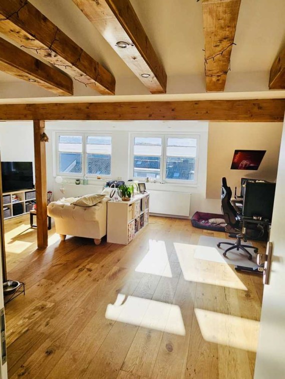 Über ein helles Treppenhaus gelangen Sie bequem zu ihrer 2025 vom Eigentümer neu erstellten Wohnung, die über ein gemütliches Wohnzimmer mit Klimaanlage verfügt. Die zwei großen und sich gegenüberliegenden Dachgauben sind in Nord-Südrichtung ausgerichtet. Genießen Sie hier Ihren Feierabend mit Fernblick. Das weißgeflieste Tageslichtbad mit dem Duschbereich und einem großen Waschtisch runden den Komfort ab. Hier ist auch Platz für Ihre Waschmaschine und einen Wäschetrockner. Die moderne Küche mit einem Essplatz ist bereits für Sie eingerichtet.