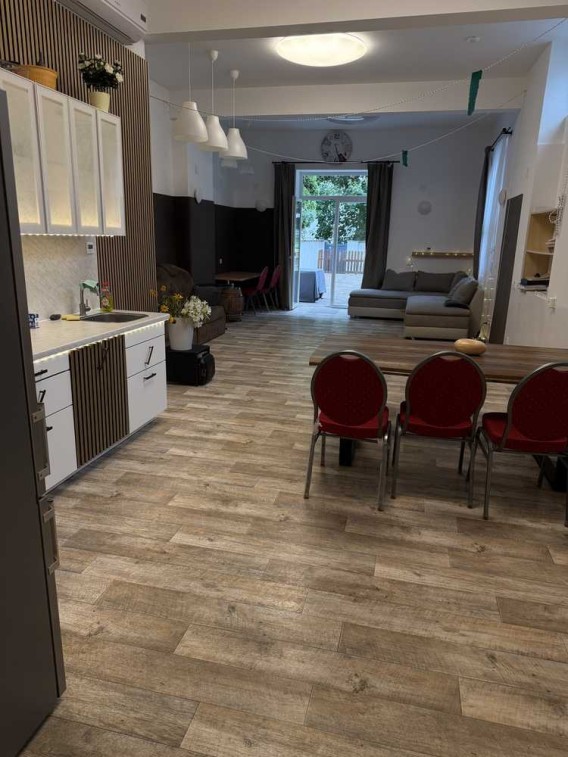 Die Wohnung ist mit einem Doppelbett und 2 Einzelbetten, 2 Kleiderschränke, 3 Tische mit 10 Stühlen, Nachttisch, Nachttischlampe, ausgestattet.
