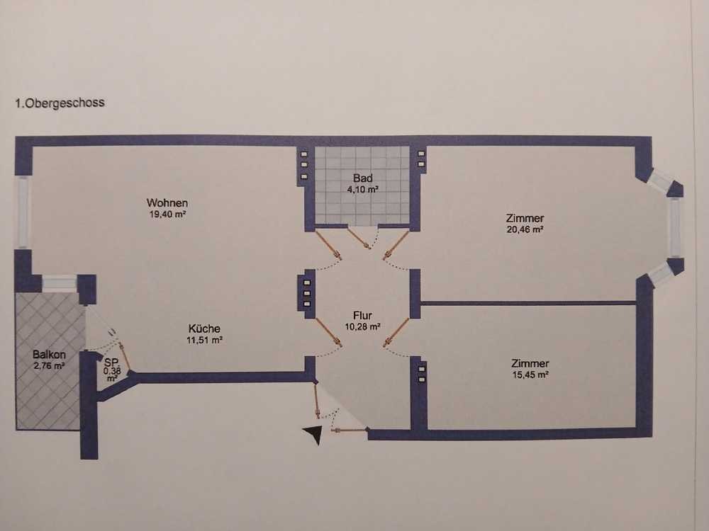 Wohnraum und Küche sind durch einen Küchentresen getrennt und nach Süden ausgerichtet.. Das innenliegende Badezimmer/WC mit Dusch-Wanne ist neu hergerichtet ebenso wie die beiden nach Norden liegenden geräumigen Zimmer, eins davon mit Erker.