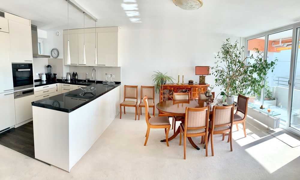 Morgens treten Sie in Ihr lichtdurchflutetes Wohnzimmer, welches die Sonnenstrahlen in warmes Licht taucht und der Blick über die Dächer Münchens Sie in den Tag begleitet. Der offene Wohnbereich bietet reichlich Platz, während die hochwertige Ausstattung sofort ein Gefühl von "Ankommen" vermittelt. Zwei elegante Zweisitzer-Couchen bieten den perfekten Rückzugsort zum Entspannen, wobei der Fernseher für gemütliche Unterhaltung sorgt.