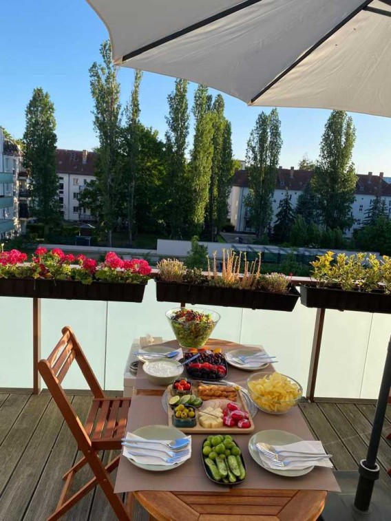 A very bright 1.5-room apartment with a large terrace, located in a luxurious and quiet building on the third floor, offering a beautiful view of the green courtyard. An elevator and a storage room are available.