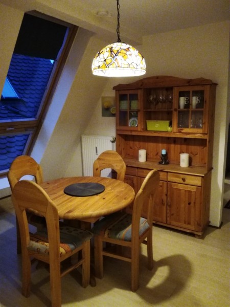 Liebevoll komplett möblierte Wohnung mit 2 Zi auf zwei Ebenen im DG eines MFH mit Café im EG enthalten. Badezimmer mit Badewanne und Waschmaschine , Böden im Wohnber.: Laminat, sonst Fliesen. Gesamte ausgewiesene Wohnfläche ca. 55m².
